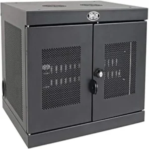 Vertical open-frame tower that charges up to 16 Chromebooks or tablets with organized AC access.